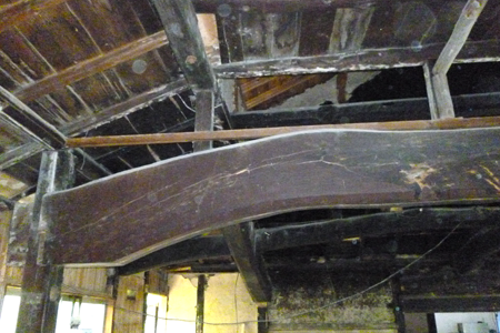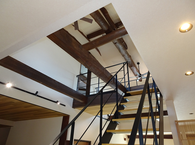 吹抜けの大空間と再生された梁